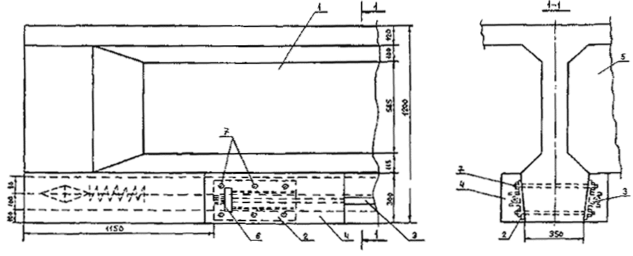 1 - усиляемая балка; 2 - плита балки; 3 - уширение в нижней части стенки балки; 4 - омоноличиваемый упор; 5 - отгибающее устройство; 6 - пучок