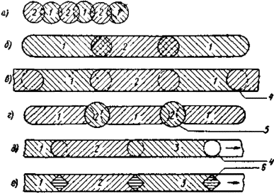 временными разделительными шаблонами (ограничителями); е - завесы в непрерывной траншее с постоянными разделительными