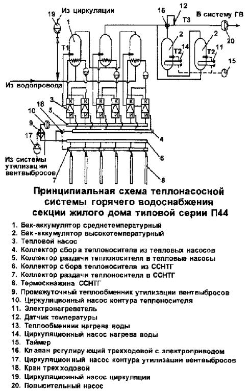Принципиальная схема теплонасосной системы горячего водоснабжения секции жилого дома типовой серии П44 показана на рисунке 5.
