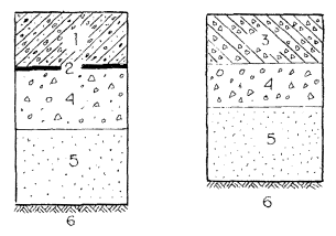 1 - цементобетон М350 - 100; 2 - пергамин или полиэтиленовая пленка; 3 - плиты с бортами; 4 - технологический слой из щебня; 5 - песок среднезернистый; 6 - грунт земляного полотна.
