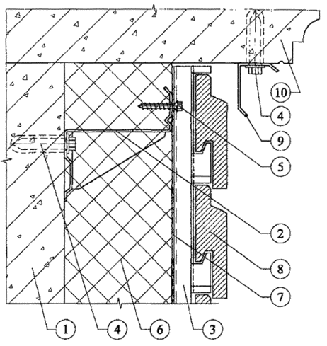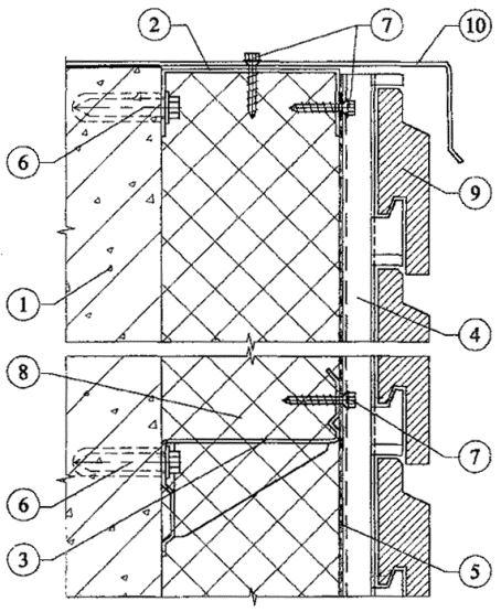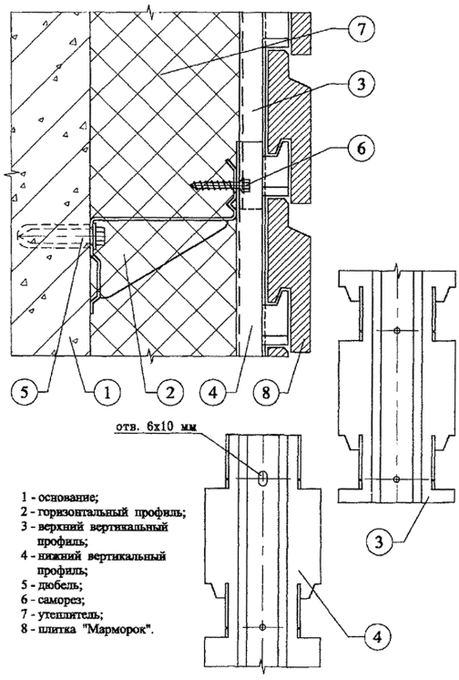 Облицовочный слой и плиты утеплителя надежно крепятся на стене (основании) с помощью специальных профилей (вертикальных и горизонтальных), изготовленных из оцинкованной листовой стали.