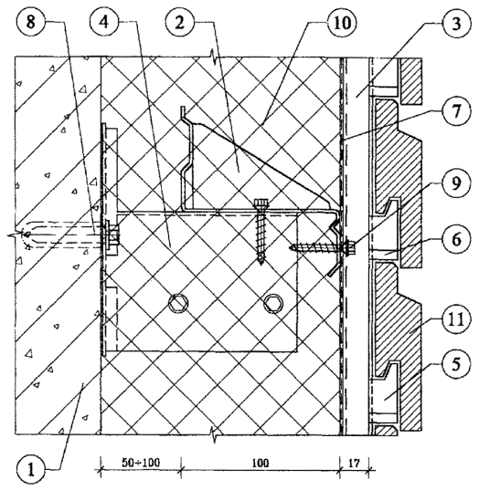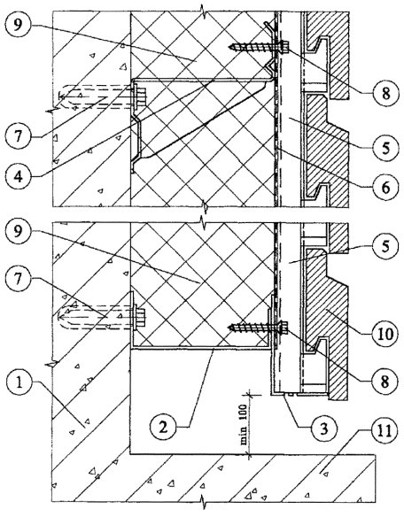 Рис. 3.11. Вертикальный разрез системы при толщине плит утеплителя 100 мм (система без кронштейнов).