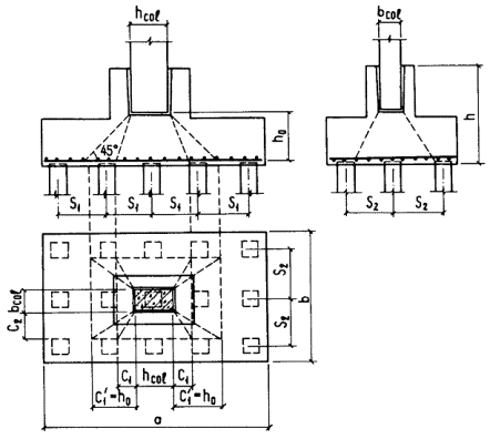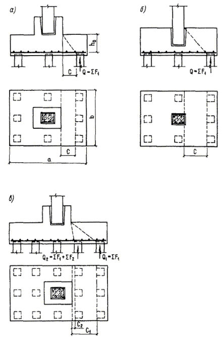 2.1. Расчет по прочности плитной части ростверков под сборные железобетонные колонны производится: на продавливание колонной; продавливание угловой сваей; по прочности наклонных сечений на действие поперечной силы; на изгиб по нормальному и наклонному сечениям; на местное сжатие (смятие) под торцами колонн. Помимо этого проверяется прочность стакана ростверка.