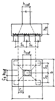 h0 - рабочая высота сечения ростверка на проверяемом участке, равная расстоянию от рабочей арматуры плиты до низа колонны, условно расположенного на 5 см выше дна стакана;