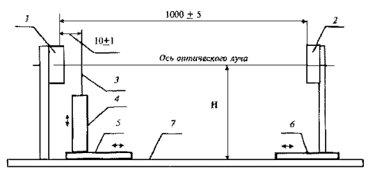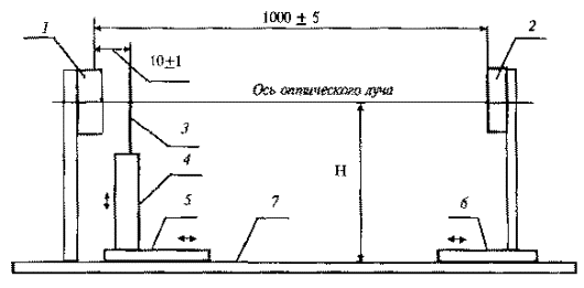1 - приемник; 2 - передатчик; 3 - аттенюатор; 4 - подставка аттенюатора, регулируемая по высоте; 5 - регулируемая опора аттенюатора; 6 - регулируемая подставка передатчика; 7 - основание измерительного стенда; Н - расстояние от оси оптического луча до основания измерительного стенда