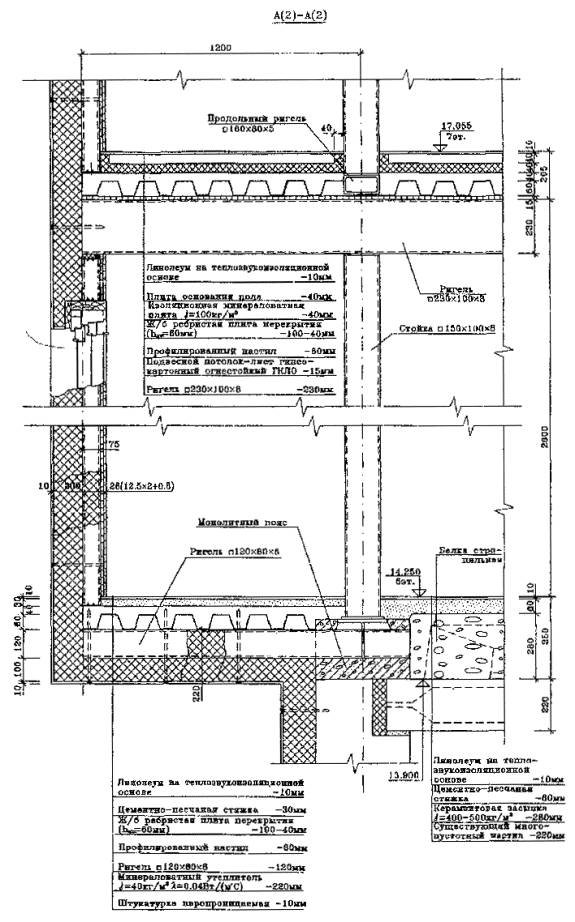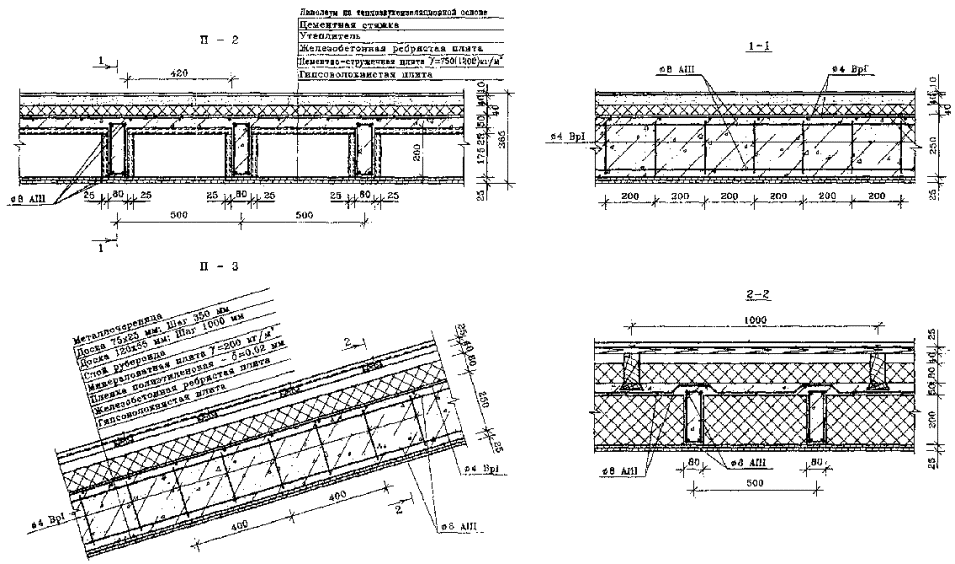 Несущая ребристая ж.б. плита по ЦСП. Снизу - 2 слоя ГВЛ. Пол плавающий по слою ПСБС. |