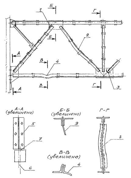 Значительная часть конструкций (более 30 %) имеет дефекты и повреждения, в том числе и категории А. Имеются существенные деформации и повреждения сжатых элементов решетки и поя сов ферм; обнаружены усталостные и хрупкие трещины в основных несущих элементах. Отмечаются признаки перегрузки конструкций |