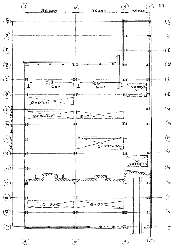 Крановое оборудование: два крана грузоподъемностью по 30 т, режимная группа 5К Воздушная среда слабоагрессивная |
