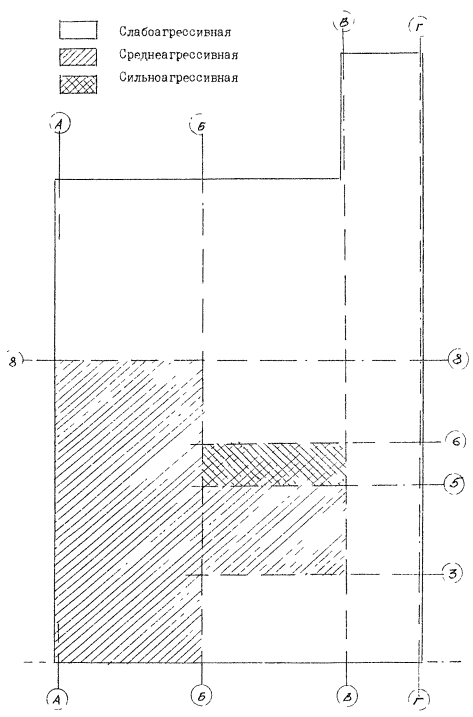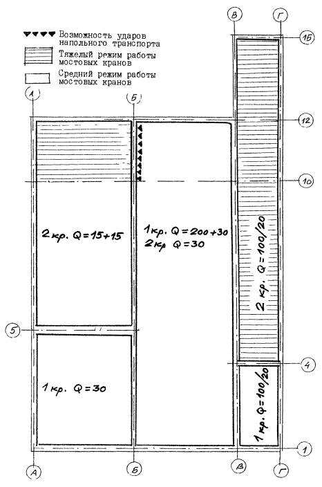 На рис. 2 показана схема зонирования здания по агрессивности газовоздушной среды, на рис. 3 - схема расположения зон и режимов работы мостовых кранов, указаны места, в которых возможны удары напольного транспорта вследствие наездов на колонны. С учетом представленных схем здание разделено на десять зон, отличающихся одна от другой условиями работы конструкций (таблица).