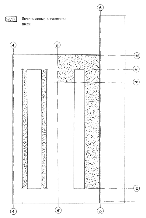 На рис. 4 изображена схема зонирования кровли здания по интенсивности пылевых отложений. Наиболее сильное отложение пыли предполагается между фонарем и ветроотбойным щитом в пролете А - Б, а также между фонарем в пролете Б - В и перепадом высот кровли по оси В. В этих зонах необходимо очищать кровлю от пыли один раз в месяц, в других зонах - один раз в три месяца.