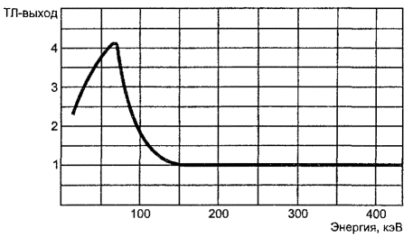 Однако для типичного энергетического спектра атомной бомбы на расстоянии более 1 км от эпицентра флюенс фотонов с энергией менее 200 кэВ составляет менее 4 % по данным указанной работы. Поэтому в реальных измерениях доз облучения по ТЛ кварца на загрязненных в результате ядерных испытаний и аварий территориях при неизвестном энергетическом спектре гамма-излучения энергетическую зависимость можно не учитывать. В случае, если энергетический спектр известен, следует сделать поправку на зависимость измеренных величин поглощенной дозы от энергии гамма-излучения в соответствии с зависимостью интенсивности ТЛ кварца, представленной на рисунке B.1.