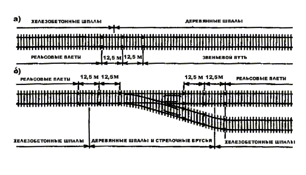 Рис. 2.1. Схемы примыкания бесстыкового пути на железобетонных шпалах к звеньевому пути (а) и к стрелочному переводу (б)