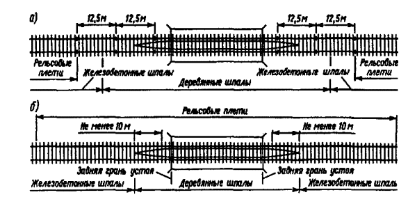 Рис. 2.2. Схемы расположения железобетонных и деревянных шпал при примыкании рельсовых плетей к мостам (а) и при перекрытии мостов рельсовыми плетями (б)