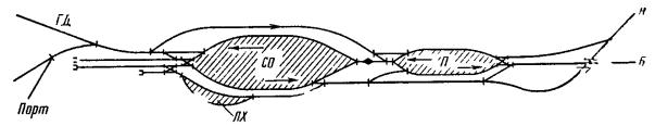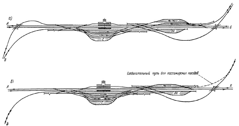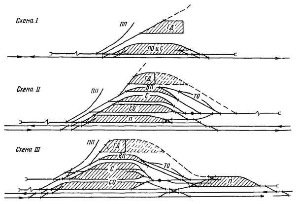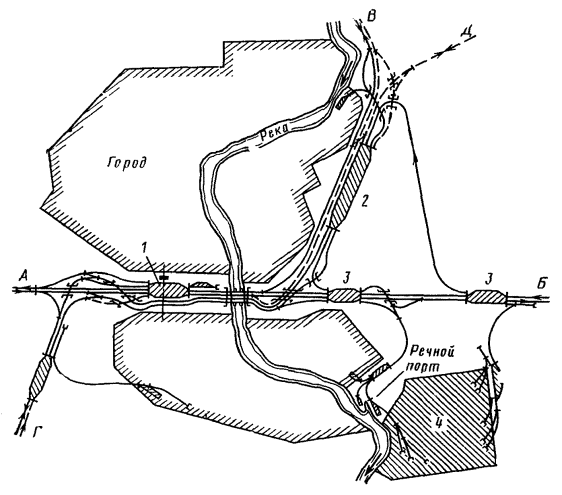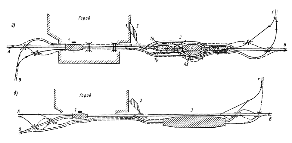 Генеральные схемы и ТЭО развития железнодорожных узлов и крупных станций следует разрабатывать в увязке с проектами планировки городов, промышленных узлов (районов) и развития всех видов транспорта как составных частей единой транспортной системы, определяя взаимное расположение станций, подходов главных и соединительных путей и обходов с учетом перспективы роста прилегающих населенных мест, промышленных предприятий и сооружений других видов транспорта.