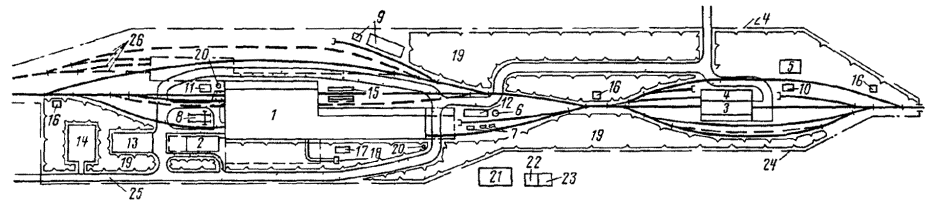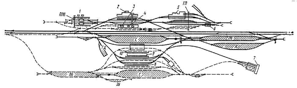 Проекты строительства (развития) станций должны устанавливать взаимное расположение парков, устройств локомотивного и вагонного хозяйств, пассажирских, грузовых и других устройств станций и должны быть также увязаны с перспективным планом и генеральной схемой их развития, с планировкой городов и населенных мест и развитием других видов транспорта, промышленности и сельского хозяйства.