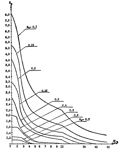 При определении КИ группы электроприемников как средневзвешенного справочного значения характерных категорий произведение КИРН не должно рассматриваться как среднее значение ожидаемой нагрузки, так как в нем не учтен фактор снижения расчетных значений КИ при увеличении числа электроприемников в группе. Указанный фактор учитывается в номограмме (см. рисунок) и табл. 1-3 в соответствии с аналитическими выражениями, приведенными в /1/, а в формуляре КИРН используется как промежуточная расчетная величина, позволяющая сохранить традиционный алгоритм расчета.