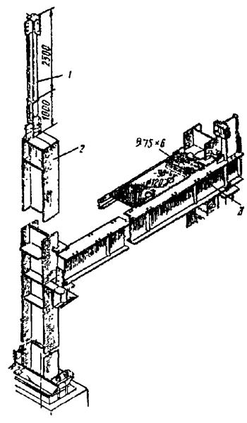 1 - надопорная стойка; 2 - стальная колонна постоянного сечения; 3 - подкрановая балка