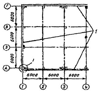 1. Обозначения: 1 - молниеприемник; 2 - оттяжка; 3 - колонна, арматура которой используется в качестве токоотвода; 4 - плиты перекрытия; 5 - ригели; 6 - фундамент - заземлитель; 7 - стропильная стальная конструкция; 8 - стеновая панель; 9 - опорный столик.