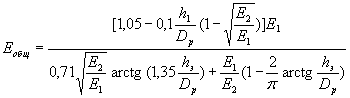 1 - бетонное покрытие; Еб, mб, hб - соответственно модуль упругости, коэффициент Пуассона, толщина бетонного покрытия; 2 - верхний слой основания; Ео, mо, hо - соответственно модуль упругости, коэффициент Пуассона, толщина слоя; 3 - многослойное основание; Еобщ, Мобщ - соответственно модуль упругости, коэффициент (общий) Пуассона основания