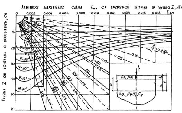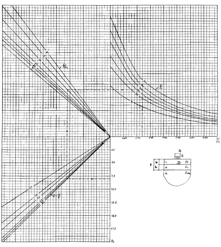 Рис. 3. Номограмма для определения максимальных растягивающих напряжений при изгибе неограниченной в плане плиты на упругом двухслойном основании (hб/Dр = 0,20 ¸ 0,60):
