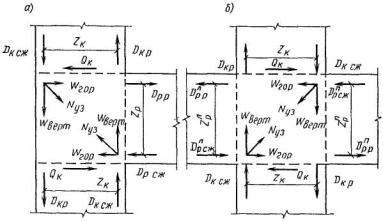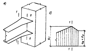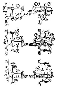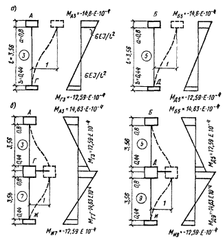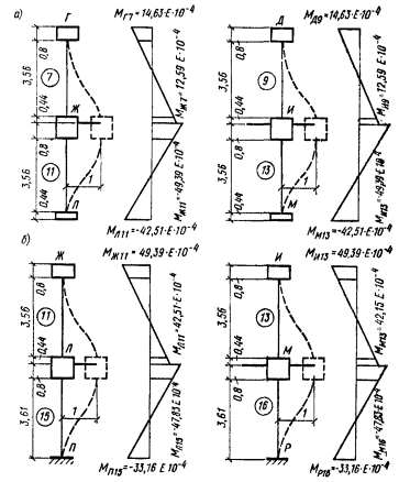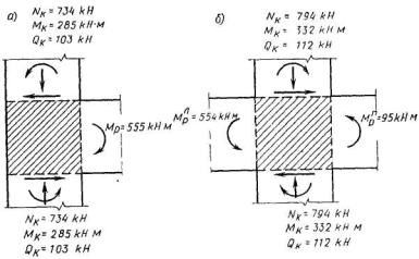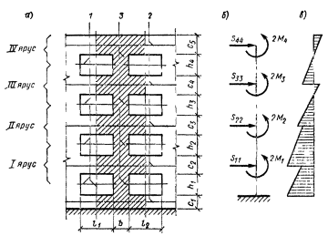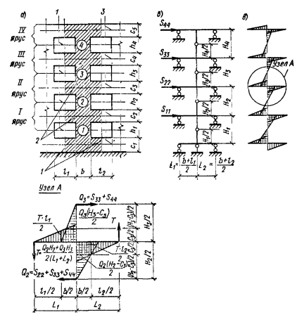 Согласно указанию п. 5.36 расчетные усилия в простенке и горизонтальных поясах от действия сейсмической нагрузки определяем исходя из допущения, что нулевые точки моментов располагаются по вертикали в середине расстояния между осями горизонтальных поясов, а по горизонтали симметрично относительно вертикальных осей проемов. Эпюры изгибающих моментов изображены на рис. 149, б.