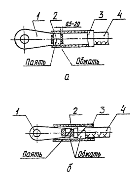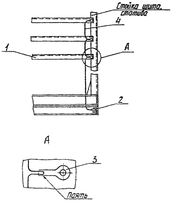 1 - лента К-266 с кнопкой К227; 2 - скоба; 3 - изоляционный материал; 4 - угольник для крепления кабелей