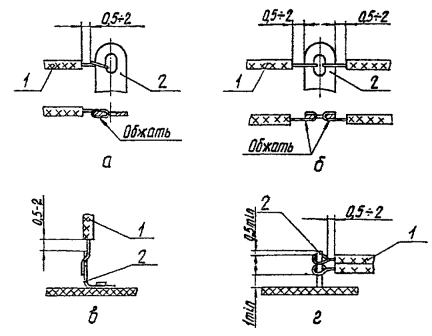 Жесткое закрепление жгута должно осуществляться с помощью скоб СО по ТУ 36.1086-84, а также хомутов и т.п. изделий. При применении металлических крепежных изделий для предотвращения повреждения изоляции проводов под крепежные детали должны быть проложены прокладки из изоляционного материала толщиной 0,5-1 мм, или подмотана изоляционная лента в 2-3 слоя. Изоляционный материал должен выступать за края крепежных деталей на 1-3 мм.