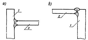 а - тавровое; б - угловое; 1 - «объемлющий» лист; 2 - «входящий» лист