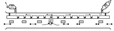 При эксплуатационных режимах вентиляции в случае невысоких значений интенсивности движения транспортных средств вентиляцию тоннеля следует осуществлять по продольной схеме. При высокой интенсивности движения транспорта схема вентиляции, изображенная на рисунке 8.4, легко перестраивается в продольно-поперечную схему, приведенную на рисунке 8.5, при которой свежий воздух подается вентиляторами, расположенными на портале в сервисный тоннель, а из него через сбойки поступает в тоннель с возможностью движения по нему в противоположных направлениях.