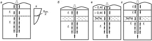 «7.2.12 Отрицательное трение учитывают до глубины, на которой значения осадки околосвайного грунта после возведения и загрузки свайного фундамента превышают половину предельного значения осадки для проектируемого здания или сооружения. Расчетные сопротивления грунта fi принимают по таблице 7.3 со знаком «минус», а для торфа, ила, сапропеля - минус 5 кПа (рисунок 1в, а). Если в пределах длины погруженной части сваи залегают напластования торфа толщиной более 30 см и возможна планировка территории подсыпкой или иная ее загрузка, эквивалентная подсыпке, то расчетное сопротивление грунта fi, расположенного выше подошвы наинизшего (в пределах длины погруженной части сваи) слоя торфа, следует принимать: