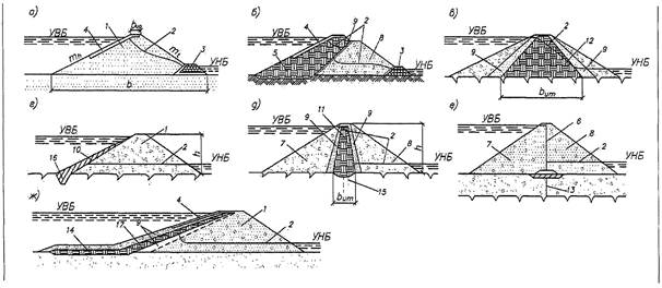 а - е - см. таблицу 4; 1 - крепление верхового откоса; 2 - тело плотины; 3 - дренаж;