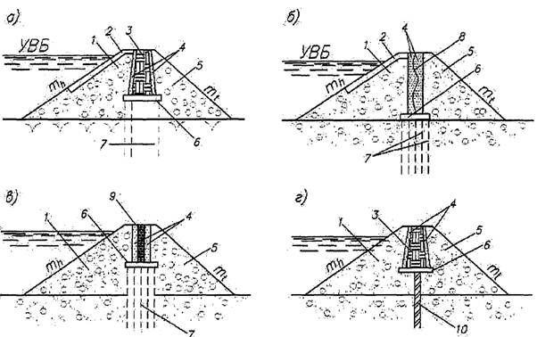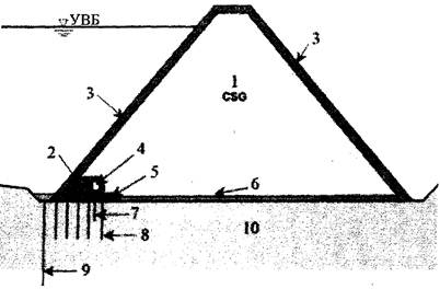 7 - дренаж; 8 - площадная цементация; 9 - цементационная завеса; 10 - грунт основания