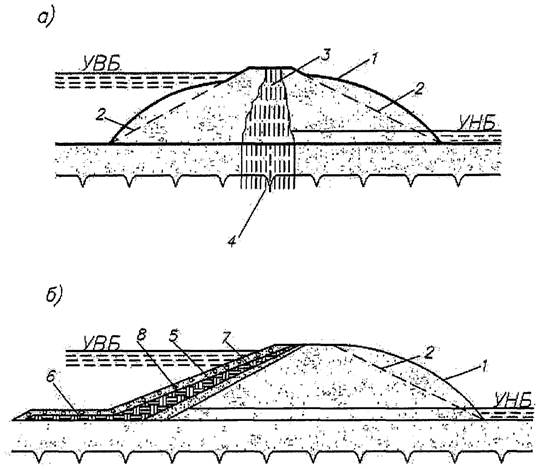 5 - верховая противофильтрационная призма из негрунтовых материалов; 6 - диафрагма; 7 - верховая