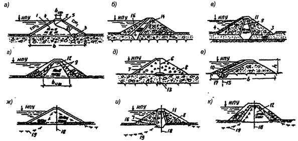 ядро; 12 - центральная грунтовая противофильтрационная призма; 13 - шпунт или стенка; 14 - понур;