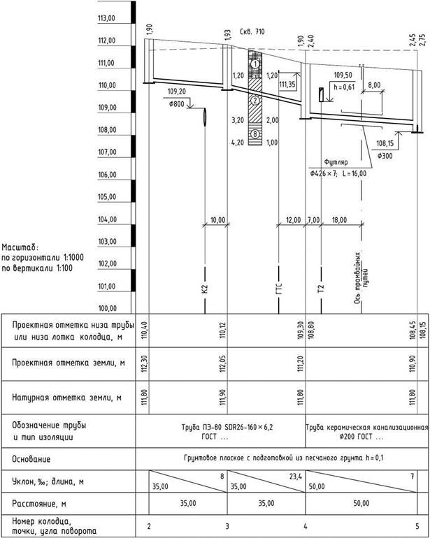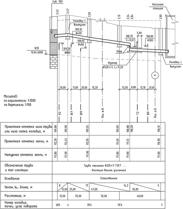 Пример оформления продольного профиля самотечной сети при подземной прокладке приведен на рисунке В.2 (приложение В).