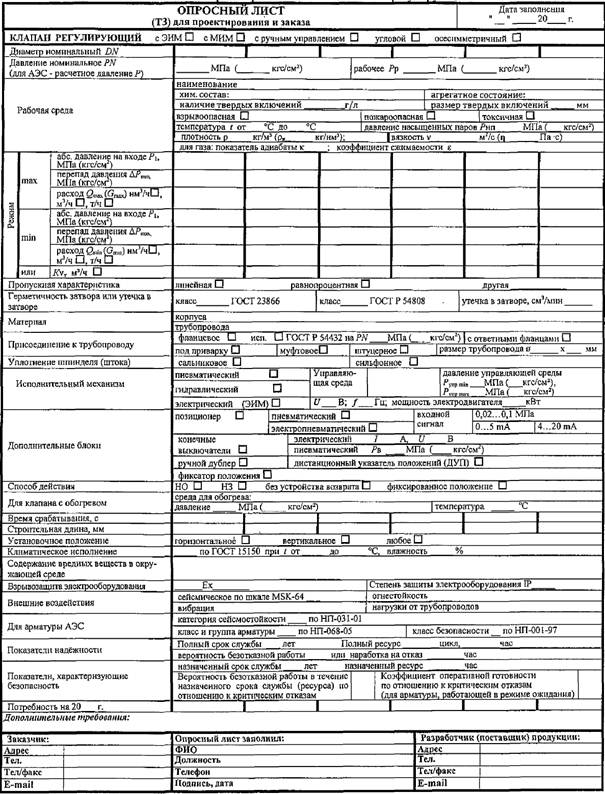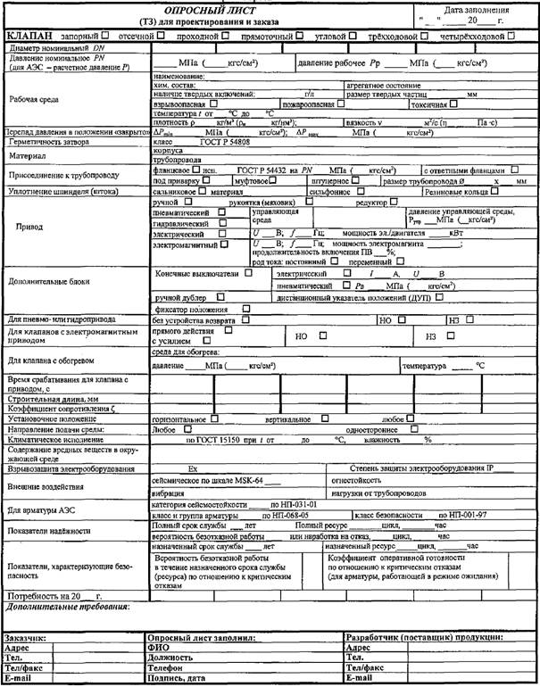 Форма опросного листа на клапаны