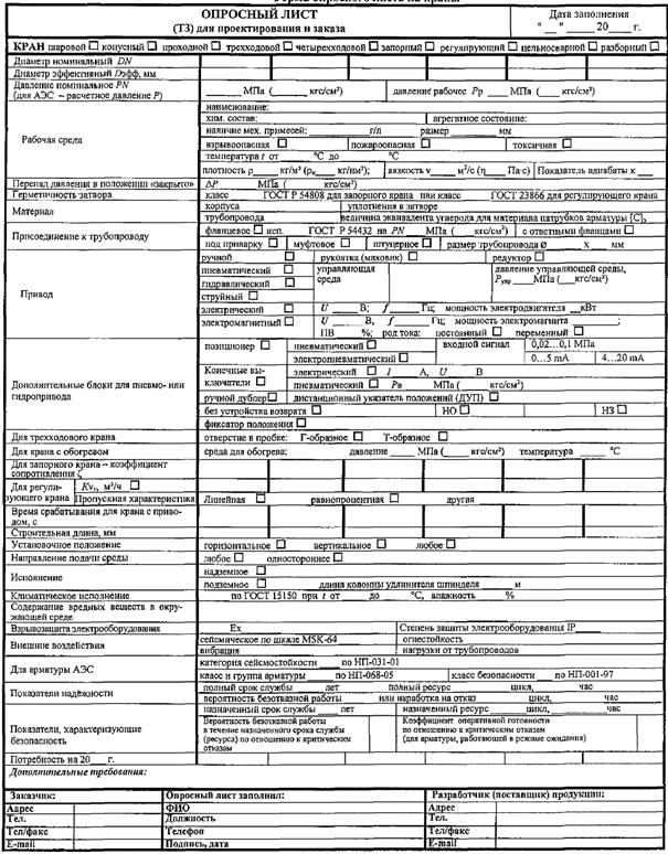 Форма опросного листа на краны