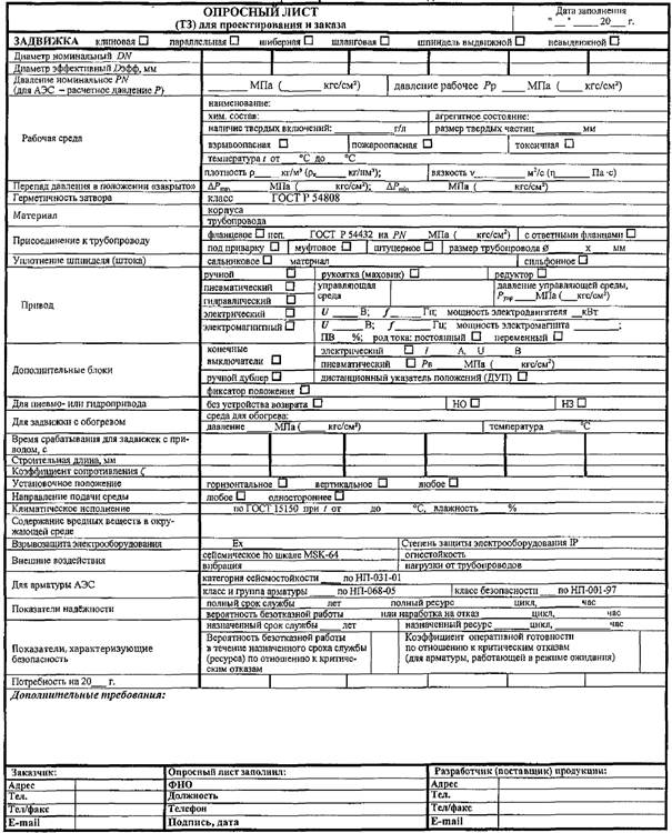 Форма опросного листа на задвижки