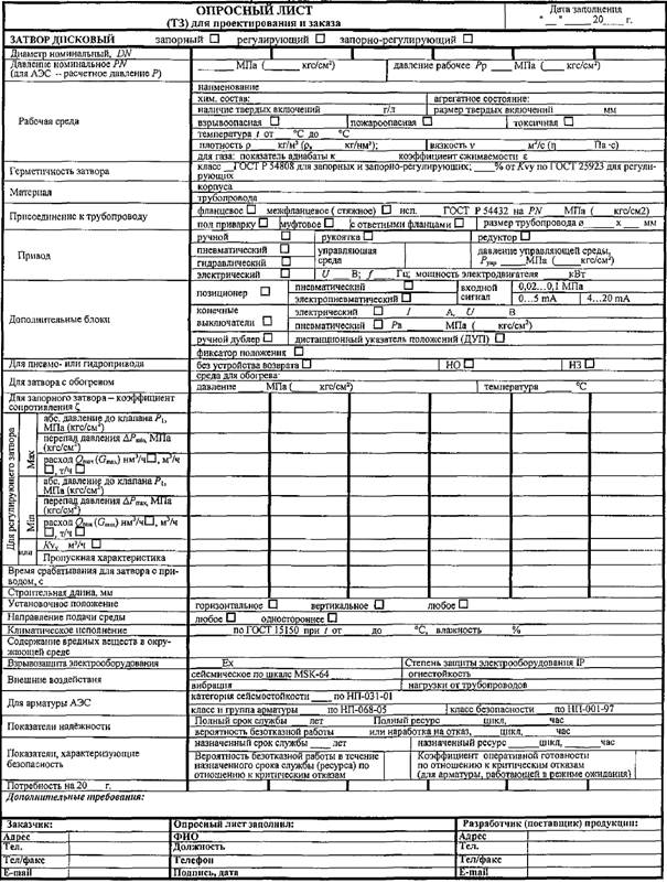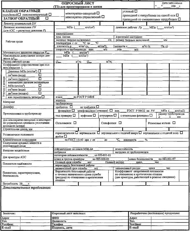 5.2 Исходные технические требования на различные типы арматуры должны соответствовать содержанию опросных листов. Рекомендуемые формы опросных листов приведены в приложениях: