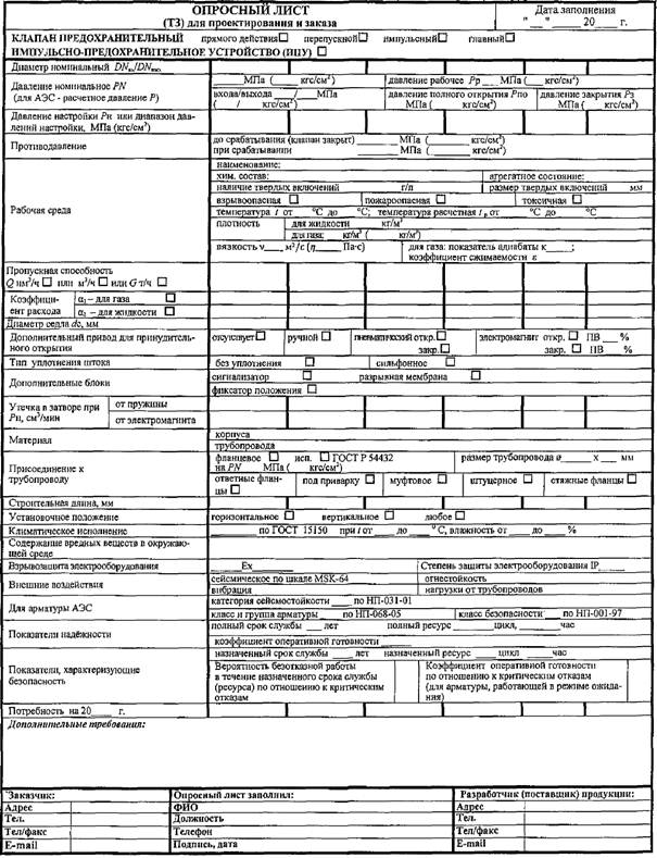Форма опросного листа на предохранительную арматуру