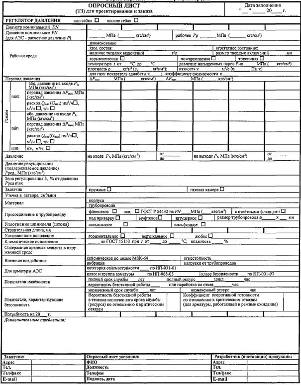 Форма опросного листа на регулятор давления