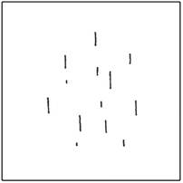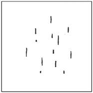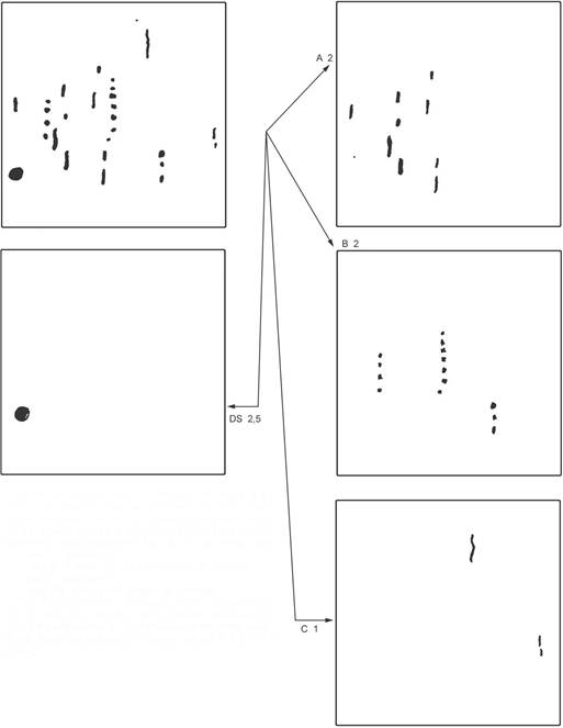Верхний слева чертеж на рисунке В.1 показывает поле, наблюдаемое при увеличении ´ 100, на котором можно различить четыре типа неметаллических включений. В зависимости от их формы и распределения эти включения классифицируют как следующие четыре типа: - тип А, сульфиды; - тип В, алюминаты (разрушенные включения); - тип С, силикаты; - тип DS, одно глобулярное включение. Наблюдаемое поле оценивают путем его сравнения для каждого типа включений с наиболее близким эталонным изображением, не учитывая другие типы включений. Такая оценка дает следующие баллы: А 2, В 2, С 1 и DS 2,5. Рисунок В.1 - Оценка поля |
