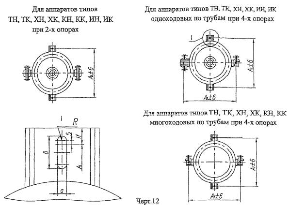 Расположение опор и штуцеров вертикальных аппаратов типов ТН, ТК, ХН, ХК, КН, КК, ИН, ИК