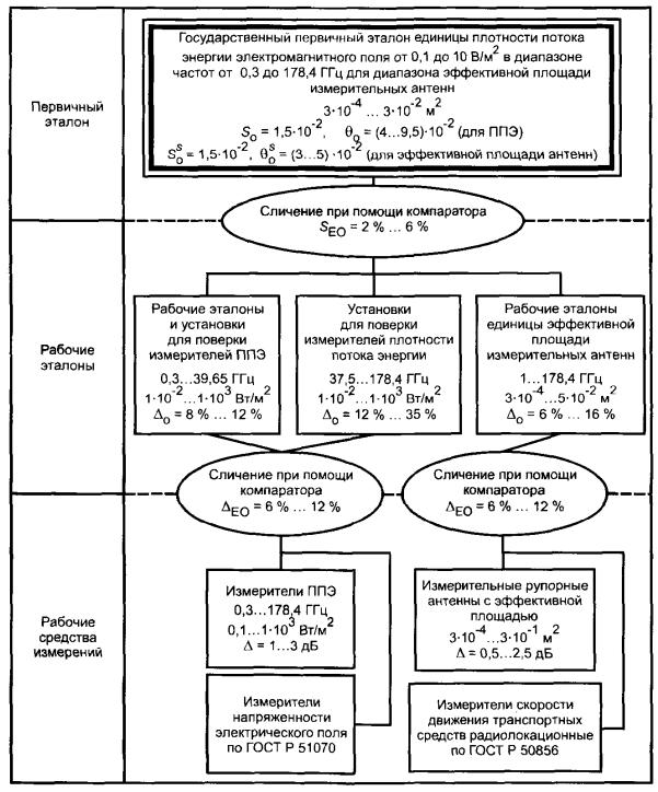 «Настоящий стандарт распространяется на государственную поверочную схему (рисунок А.1, приложение А) для средств измерений плотности потока энергии электромагнитного поля в диапазоне частот от 0,3 до 178,4 ГГц и устанавливает порядок передачи размера единицы плотности потока энергии электромагнитного поля - ватт на квадратный метр (Вт/м2) - в диапазоне от 1 · 10-2 до 1 · 103 Вт/м2 и единицы эффективной площади измерительных антенн (далее - антенны) - квадратный метр (м2) - в диапазоне от 3 · 10-4 до 3 · 10-1 м2 от государственного эталона Российской Федерации (далее - государственный эталон) посредством рабочих эталонов и поверочных установок рабочим средствам измерений с указанием погрешностей и основных методов поверки.