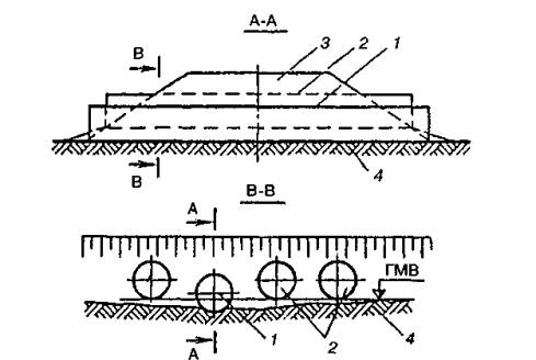 1 - очко, установленное на отметке русла водотока; 2 - очки, установленные над горизонтом меженных вод; 3 - насыпь; 4 - основание