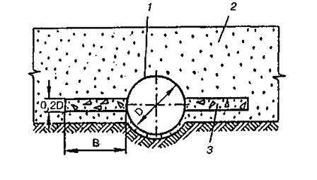 1 - труба; 2 - грунт засыпки; 3 - жесткий слой; D - диаметр трубы; В - ширина жесткого слоя поперек трубы