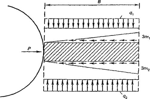где q1,2 - нормальное давление от веса грунта засыпки соответственно по верхней и нижней поверхностям жесткого слоя, определяемое по СН 200-62;