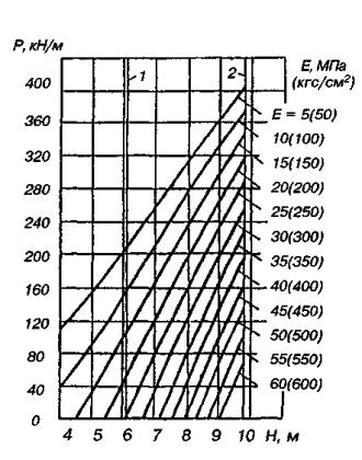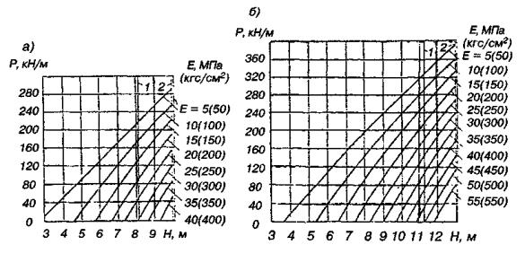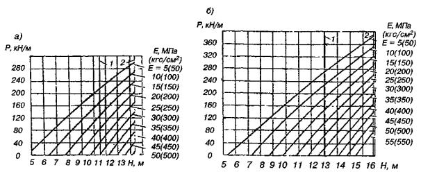По графику на рис. 2б при Н = 8 м и Е = 8 МПа находим Р = 53 кН/м (53 кгс/см).