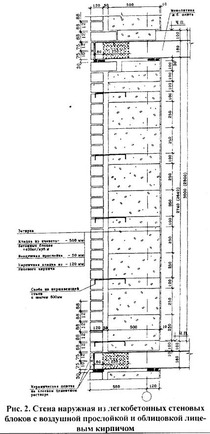 "Рис. 2. Стена наружная из легкобетонных стеновых блоков с воздушной прослойкой и облицовкой лицевым кирпичом"