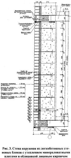 "Рис. 3. Стена наружная из легкобетонных стеновых блоков с утеплением инераловатными плитами и облицовкой лицевым кирпичом"